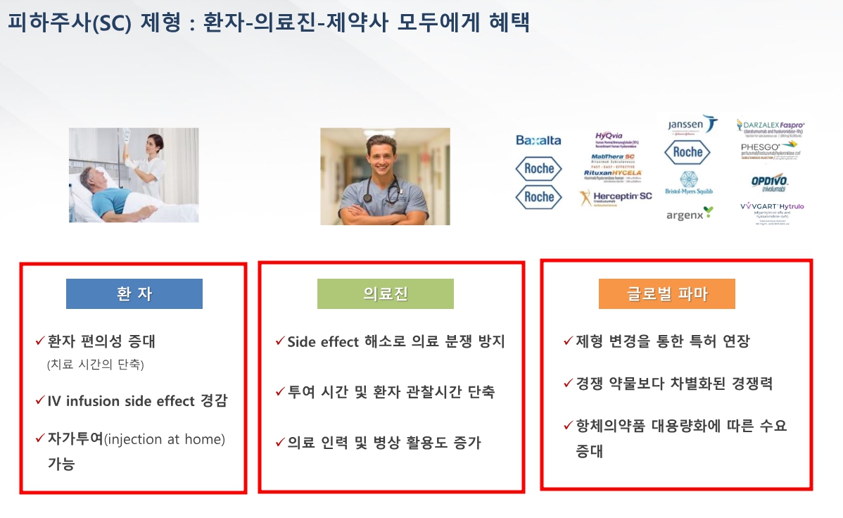 - 알토스바이오로직스가 로슈 오크레부스SC와 BMS 옵디보SC를 개발 중이므로, 로슈 티쎈트릭SC와 BMS 옵두알라그SC 가능성이 높습니다.