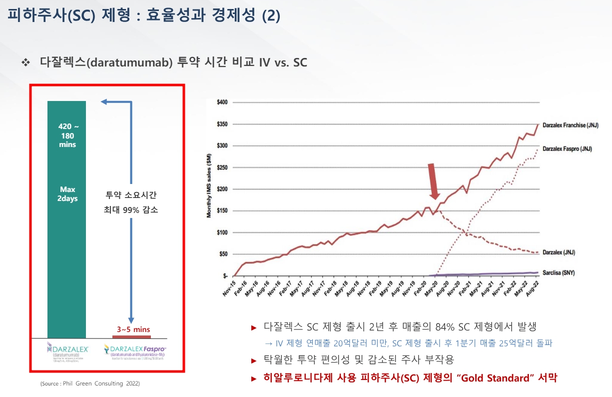- SC 개발은 환자 편의성 개선뿐만 아니라 수천억 원의 개발 비용이 필요한데, 이는 사노피가 시밀러 방어와 특허 연장을 위해 블록버스터 제품 개발에 나선 것으로 해석됩니다.