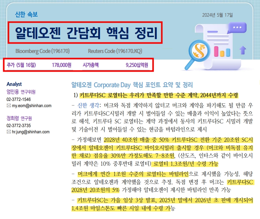 알테오젠 IR & 간담회 핵심 포인트 요약 및 정리(신한투자증권 엄민용,정희령 연구위원)