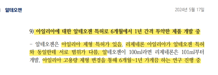 - 알테오젠은 아일리아 제형 특허를 보유하고 있으며, 리제네론 아일리아와 동일하지만 범위가 다릅니다. 알테오젠은 100ml, 리제네론은 101ml부터 개발 중입니다.