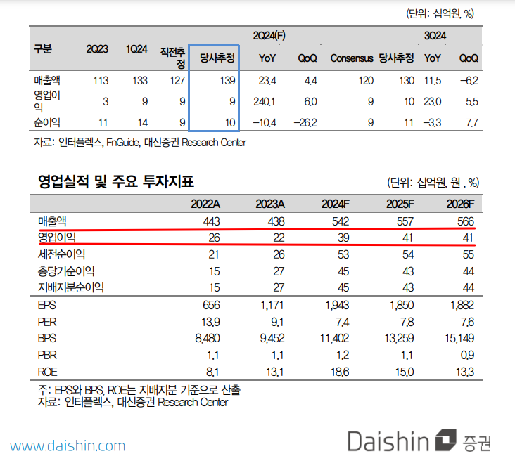 인터플렉스의 2024년 2분기 영업이익은 1,390억원(23.4% yoy, 4.4% qoq), 94.1억원(240% yoy, 6% qoq) 추정되고 있고요.