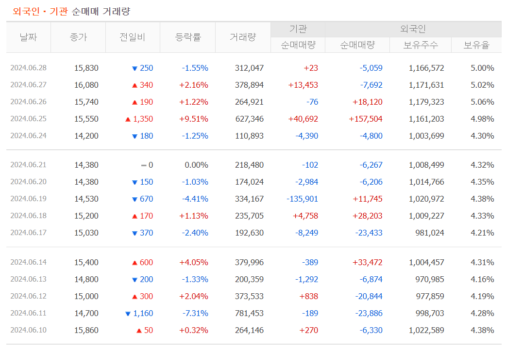 수급적으로는  부진한 흐름이 이어지고 있는 상황입니다.  이미 바닥권까지 추락한 외인과 기관의 매매가 순매수로 일부만 들어와도 쉽게 반등할 수 있단 뜻도 될 겁니다.