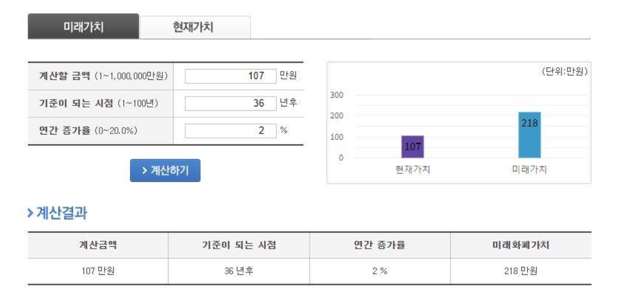 예상연금액 조회 서비스에서 화폐 시간가치 조회 서비스를 통해 현재의 예상연금액이 수십 년 후에는 얼마가 될지도 미리 확인해볼 수 있습니다.