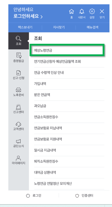 모바일 앱 내 곁에 국민연금 → 전체 메뉴 → 예상노령연금