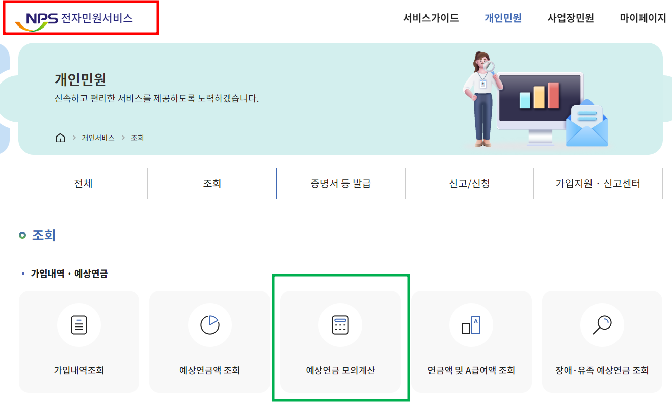 국민연금공단 홈페이지 → 로그인 필요→전자민원서비스 → 개인서비스 → 예상연금액 조회