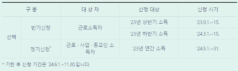 근로소득만 있는자는 반기신청과 정기신청을 선택하여 신청할수있고, 사업 또는 종교인 소득이 있는자는 정기신청을 하셔야합니다.