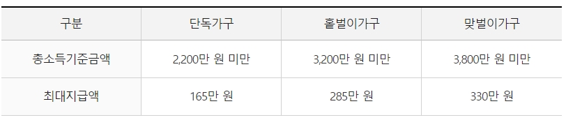 ㆍ 홑벌이가구 : 배우자 또는 부양자녀 또는 70세 이상 직계존속이 있는 가구(배우자가 있는 경우에는 신청인 또는 배우자의 총급여액 등이 3백만원 미만이어야 함)