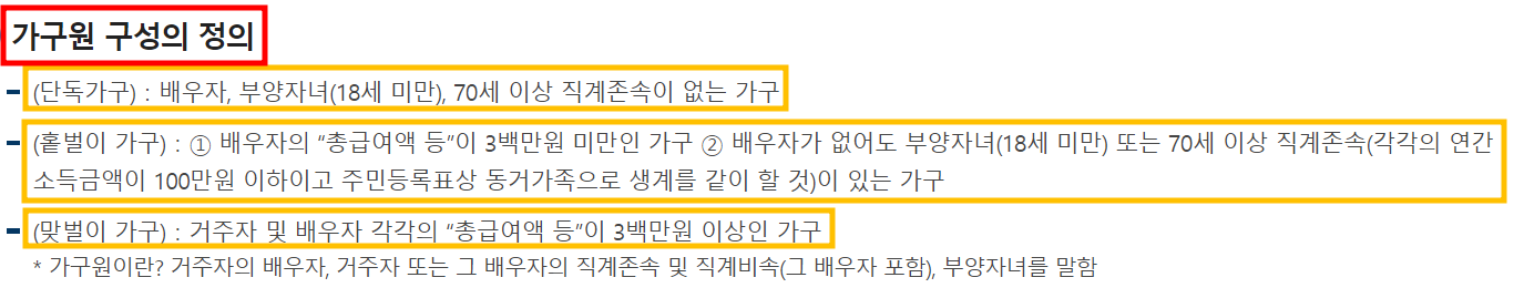 - 배우자가 없어도 부양자녀(18세 미만) 또는 70세 이상 직계존속(각각의 연간 소득금액이 100만원 이하이고 주민등록표상 동거가족으로 생계를 같이 할 것)이 있는 가구