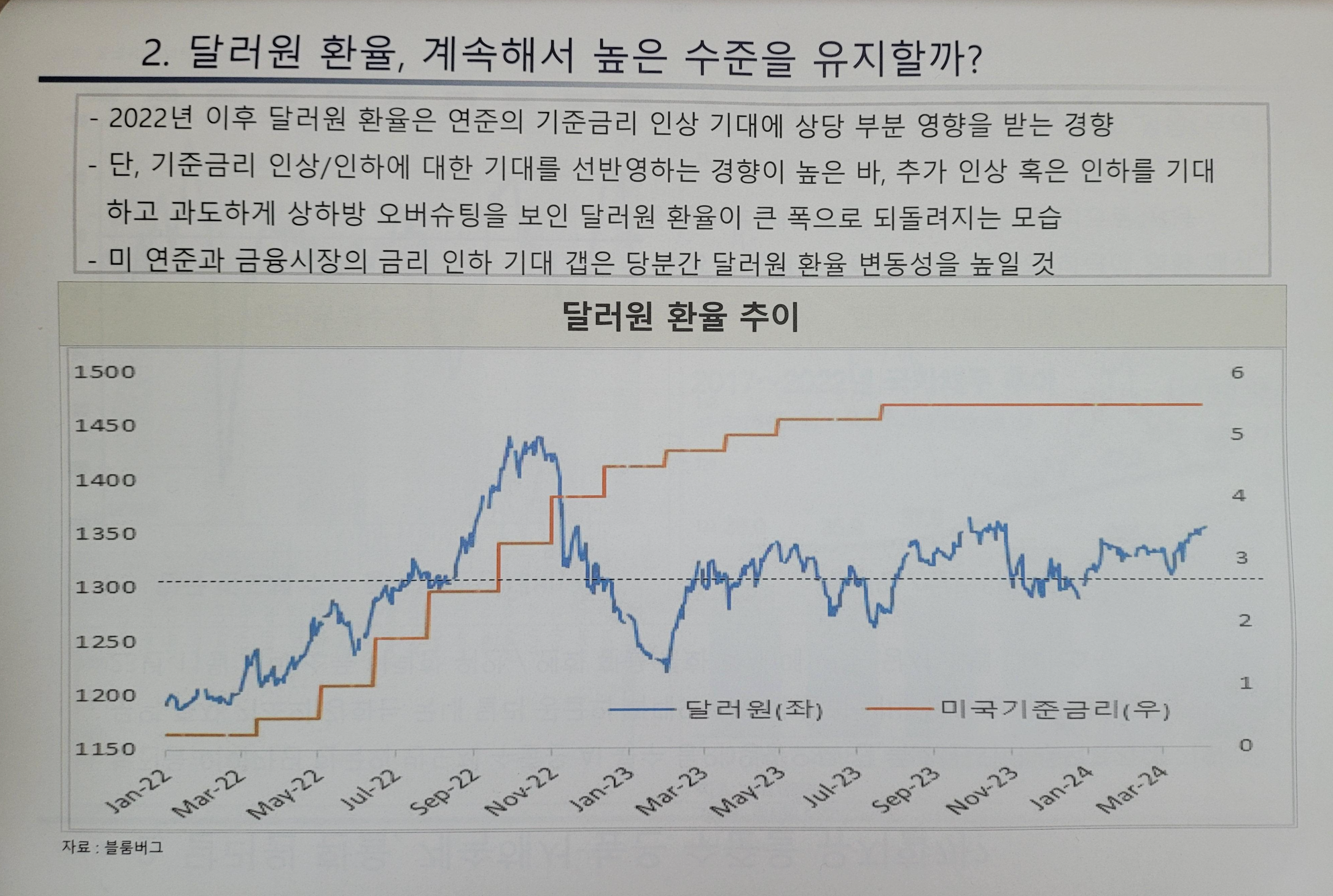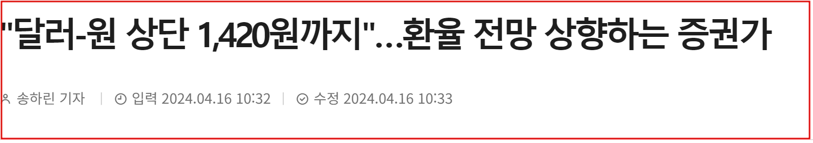 → 한국투자증권 문다운 연구원**: 최근 강달러 압력과 외국인 배당금 지급 영향으로 원화가 약세를 보이며, 2분기 달러-원 환율을 기존 1,325원에서 1,350원으로 상향 조정하였다.