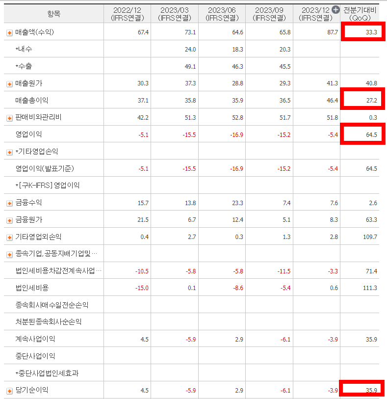 전분기 대비 연결기준 매출액은 33.3% 증가, 영업이익은 64.5% 증가, 당기순이은 35.9% 증가.  매출액,영업이익이 크게 늘어나고 있으며 흑자 전환이 멀지 않았습니다.