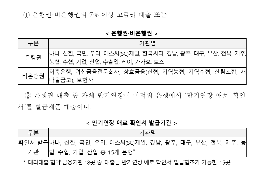 ② 은행권 대출 중 자체 만기연장이 어려워 은행에서 ‘만기연장 애로 확인서’를 발급해준 대출이다.