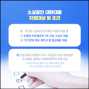 이번에 새롭게 시작하는 대환대출 프로그램은 소상공인들이 겪고 있는 고금리 대출의 부담을 낮추기 위해 마련되었습니다. 특히, 연 7% 이상의 고금리 대출을 받고 있거나, 만기 연장에 어려움을 겪고 있는 대출에 대해 저금리(4.5%)로 전환할 수 있는 기회를 제공합니다. 이 프로그램은 총 5천억 원 규모로 운영될 예정이며, 많은 소상공인들에게 실질적인 도움이 될 것으로 기대됩니다.