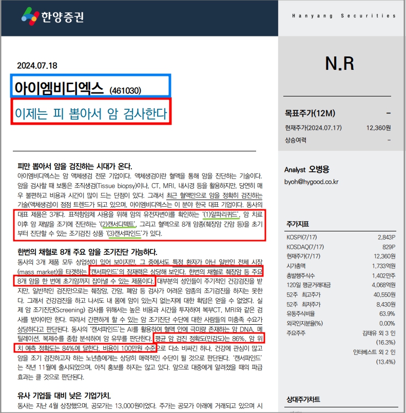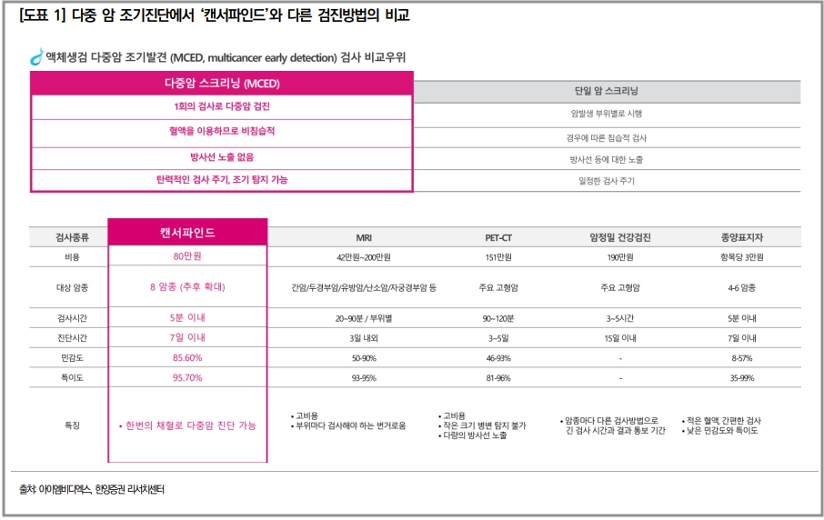 한양증권 오병용 연구원은 '캔서파인드'의 시장 잠재력이 상당하다고 분석했다. 건강검진에 관심이 많은 노년층을 중심으로 암 조기진단에 대한 수요가 크다는 것이다. 또한 유사 기업들과 비교했을 때 아이엠비디엑스의 현재 시가총액이 저평가되어 있다고 평가했다.