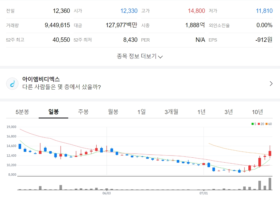 아이엠비디엑스는 공모가 1만3000원을 겨우 회복했습니다. 시가 총액은 1888억 원이며,외국인이 보유한 비중은 0.00%입니다. 아이엠비디엑스 기업의 영업이익은 -78억 원을 달성했으며 매출액은 40억 원입니다.
