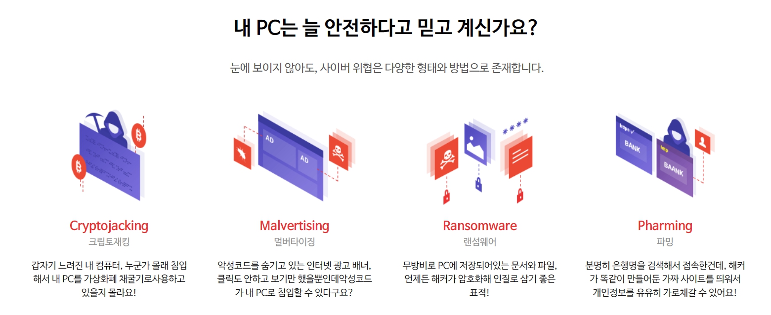 알약은 악성 프로그램 탐지 및 랜섬웨어와 파밍 공격 방지를 제공합니다. 우리의 데이터와 개인 정보를 해커로부터 보호하는 데 필수적인 프로그램이라 생각합니다. 정밀 검사나 빠른 검사를 통해 시스템의 안전을 확인하고 정기적인 업데이트와 재부팅을 통해 최적의 보안 상태를 유지해야겠습니다.