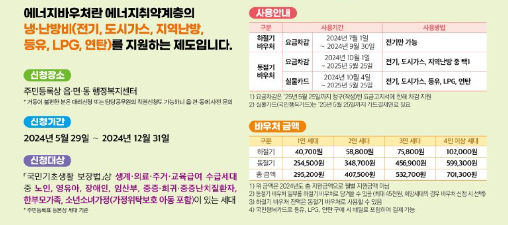 이번 에너지바우처 신청대상은 국민기초생활보장법에 따른 기초생활수급가구로, 특정 세대원 기준을 충족하는 가구입니다.