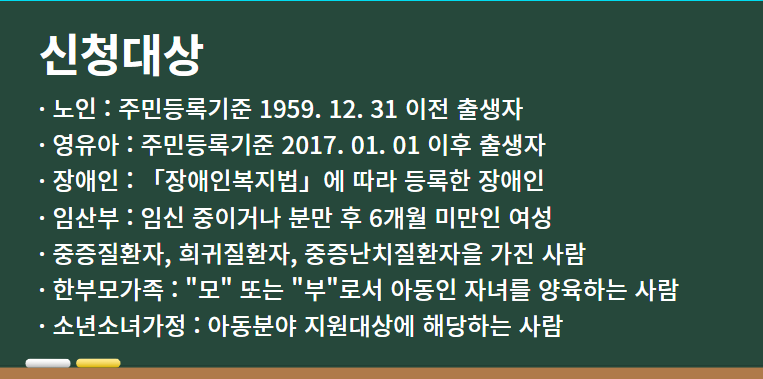 구체적으로는 본인이나 세대원이 65세 이상이거나 7세 이하, 장애인, 임산부, 중증·희귀·중증난치질환자, 한부모 가족 중 하나에 해당할 때입니다.