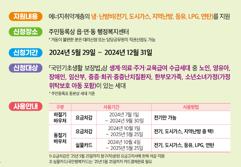 이 사업은 특히 취약계층이 여름과 겨울철에 냉난방을 걱정 없이 사용할 수 있도록 에너지 비용을 지원하는 정책이에요.