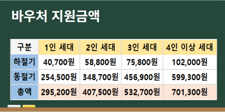 올해는 지난해보다 지원단가와 사용기간이 확대되었습니다. 지난해 세대 평균 34만7000원이었던 지원 단가가 올해 36만7000원으로 인상되었어요. 하절기에는 5만3000원, 동절기에는 31만4000원의 지원을 받게 됩니다.