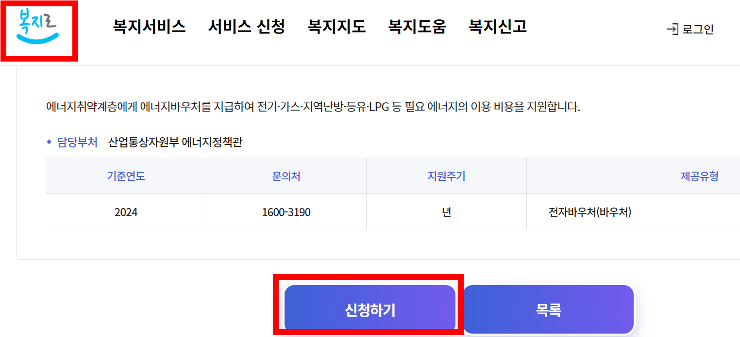 복지로 온라인신청 경로 : 복지로 로그인 > 서비스 신청 > 복지서비스 신청 > 복지급여 신청 > 저소득층 > 에너지바우처