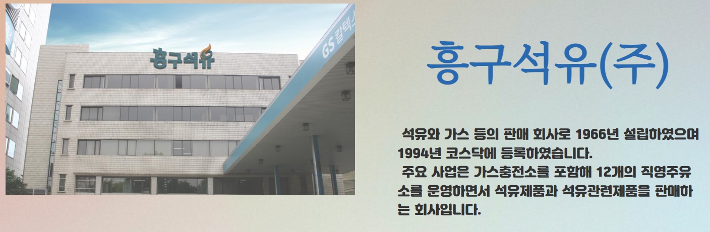 흥구석유는 석유류 제품인 휘발유, 등유, 경유등을 GS칼텍스로부터 매입해 대구경북지역에 판매하는 석유류 도.소매업체로 알려져 있다. 주요 제품 및 서비스로는 무연휘발유,저유황 경유, 등유 등이며, 일반 주유소에 공급 및 직영주유소에서 소비자에게 직접 판매하고 있다.