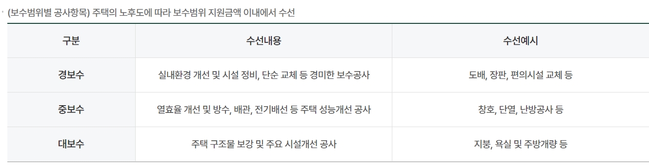 주택 등을 소유하고 그 집에 거주하는 자가가구를 대상으로 구조안전․ 설비․마감 등 주택노후도를 평가(경․중․대보수로 구분)하여 종합적인 주택개량을 지원합니다.