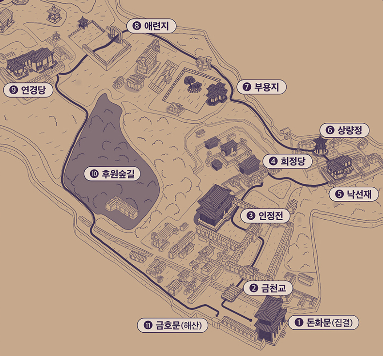 돈화문 → 진선문 → 인정전 → 희정당 → 낙선재 → 상량정 → 부용지→ 애련정과 애련지 → 연경당 → 후원 숲길 → 돈화문으로 서울에서 가장 아름다운 밤을 경험할 수 있는 기회를 놓치지 마세요.
