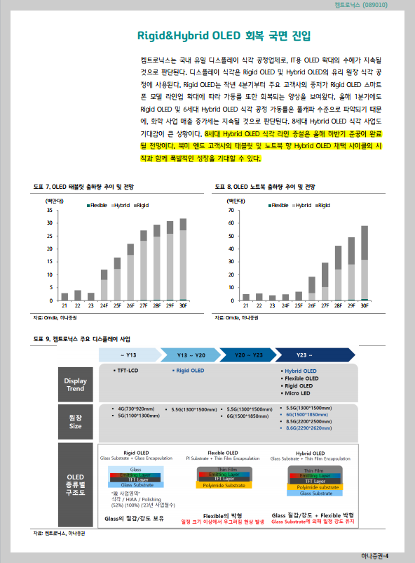 • 올해 하반기에는 1) 유리 기판 TGV 공정 진입, 2) 반도체 EUV 소재 PGMEA 퀄 테스트 완료, 3) 8세대 Hybrid OLED 식각 라인 준공 등 다수의 모멘텀 기대