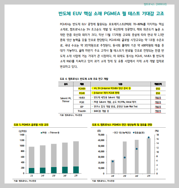 • - PGMEA는 반도체 EUV 공정에 활용되는 포토레지스트(PR)의 70~80%를 차지하는 핵심 소재로, 켐트로닉스는 5N 초고순도 개발 및 국산화에 성공