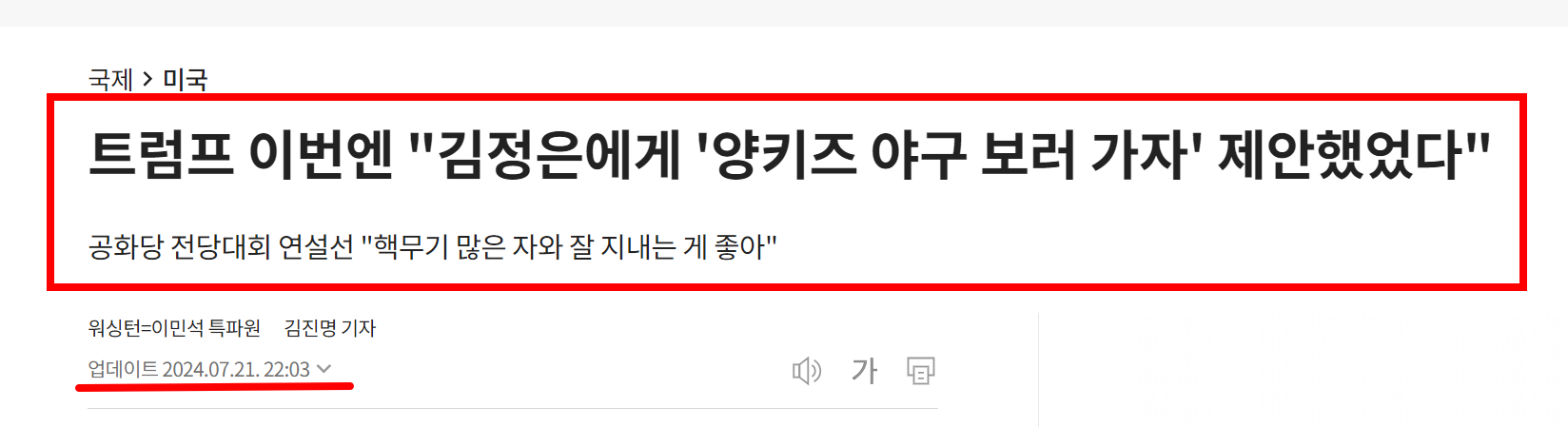 트럼프는 미시간주 유세에서 김정은에게 핵무기 대신 야구 경기를 보자고 제안했던 일을 언급하며 북핵 위협 완화에 적극적이었다고 주장했다. 트럼프의 당선 가능성이 높아지면서 국제사회는 북핵 문제와 러시아·우크라이나 전쟁 등에 대한 그의 정책 변화를 주목하고 있다.