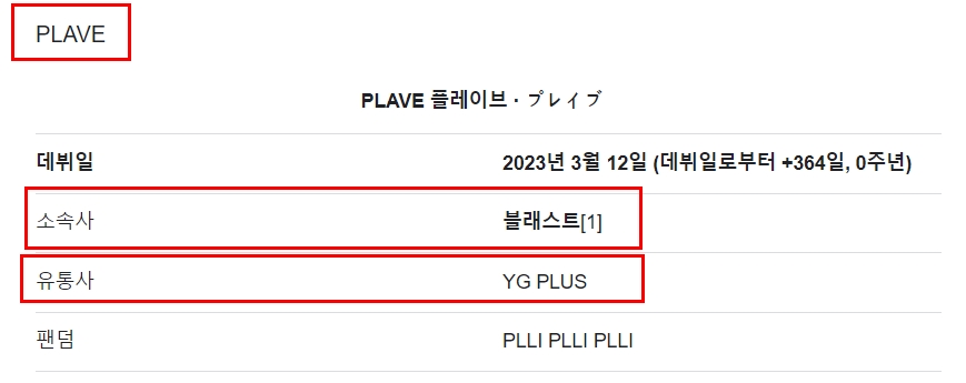플레이브 소속사는 블래스트. 유통사는 YG PLUS
