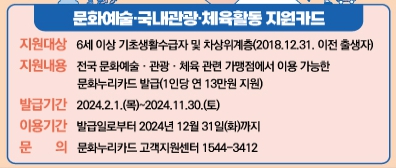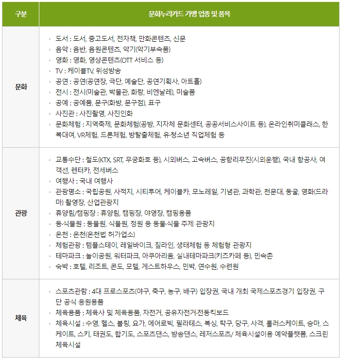 - 이 카드를 통해 사용자는 다양한 문화, 예술, 국내 여행, 스포츠 활동을 즐길 수 있으며, 이는 생활의 질을 향상시키고 사회적, 경제적 어려움으로 인한 문화 격차를 줄이는 데 목적이 있습니다.