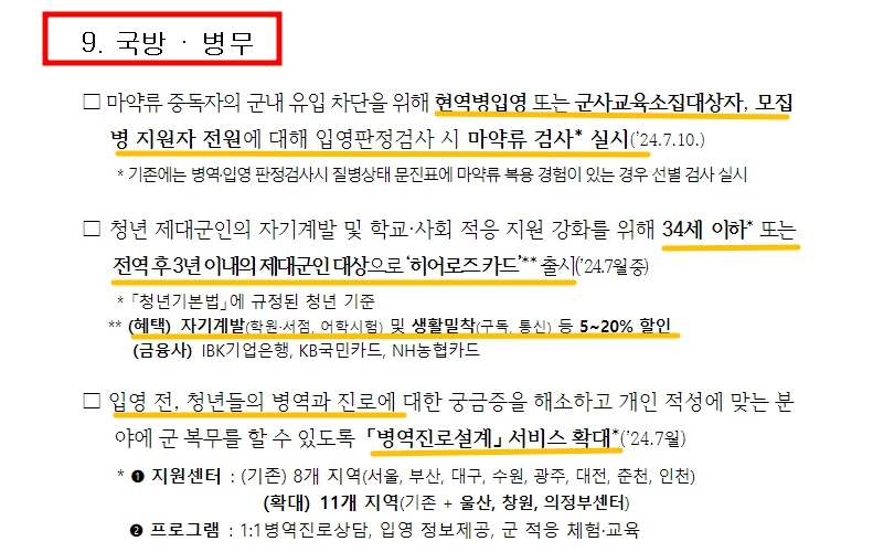 - 입영 전 청년들이 병역·진로에 대해 상담받을 수 있는 '병역진로설계' 서비스 지역을 확대하고, 34세 이하 또는 전역 후 3년 이내의 제대군인을 상대로 '히어로즈 카드'를 출시해 자기계발 등에 5~20% 할인 혜택을 받도록 지원한다.