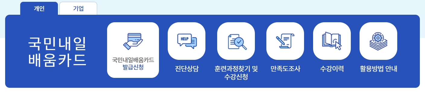 청년부터 구직자, 재직자, 재취업자까지! 국민 스스로가 자기개발을 할 수 있도록 국가에서 훈련비 등을 지원해 주는 제도입니다.