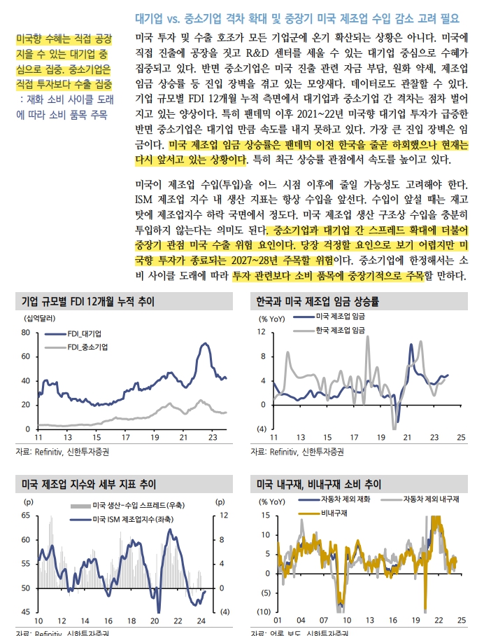 미국향 수혜는 직접 공장을 짓는 대기업 중심, 중소기업은 수출 중심. 가장 큰 장벽은 미국 제조업 임금 상승률 .