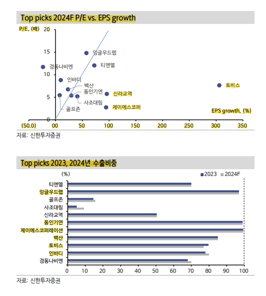 EPS높고, PER 낮은 수출 비중을 보면 토비스, 제이에스코퍼레이션 신라교역 정도.