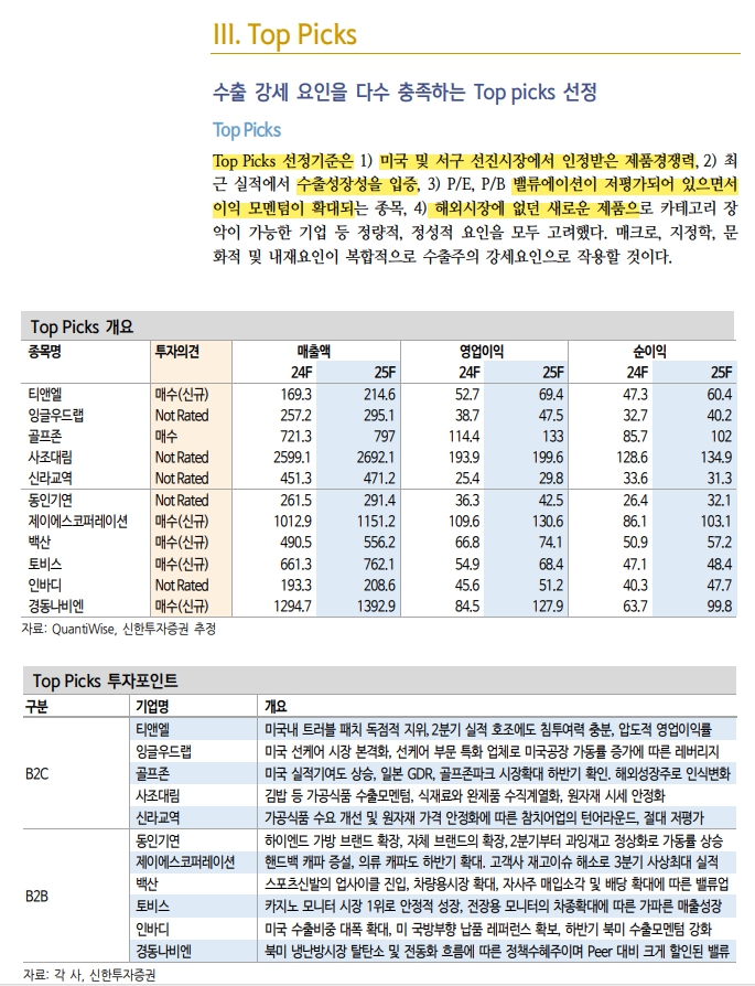 -Top Picks 선정기준: 1) 미국 및 서구 선진시장에서 인정받은 제품경쟁력, 2) 최근 실적에서 강력한 수출성장성을 입증, 3) P/E, P/B 밸류에이션이 저평가되어 있으면서 이익 모멘텀이 확대되는 종목, 4) 해외시장에 없던 새로운 제품으로 카테고리 장악이 가능한 기업 등 정량적, 정성적 요인을 모두 고려했다.