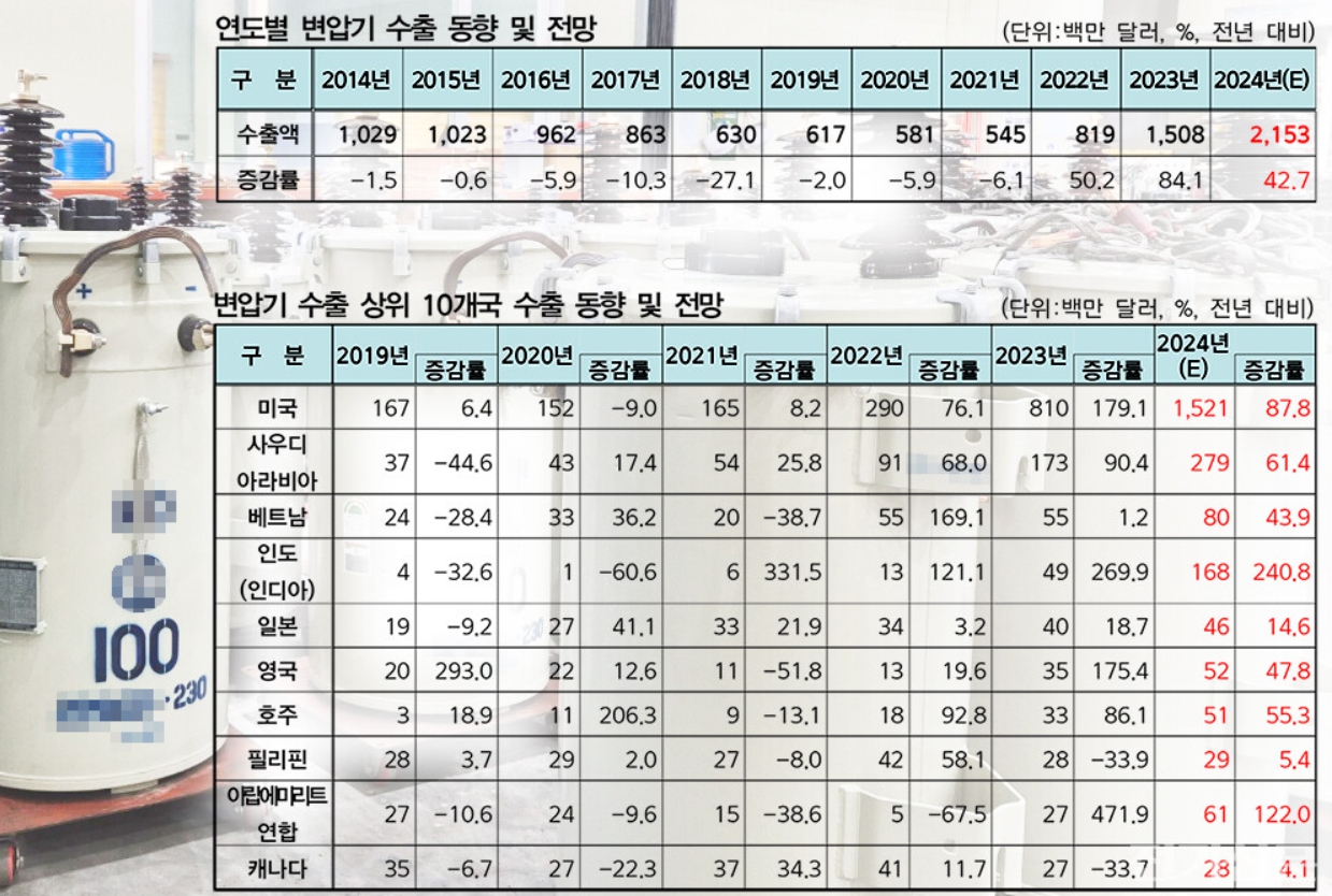 전기산업진흥회는 올해 변압기 수출이 지난해보다 42.7% 증가한 21억 5300만 달러에 달할 것으로 전망하고 있습니다. 특히 미국 수출은 전년보다 87.8% 증가한 15억 2100만 달러 수준으로 예상됩니다. 이러한 전망은 변압기 산업이 지속적인 성장을 이어갈 것임을 시사합니다.